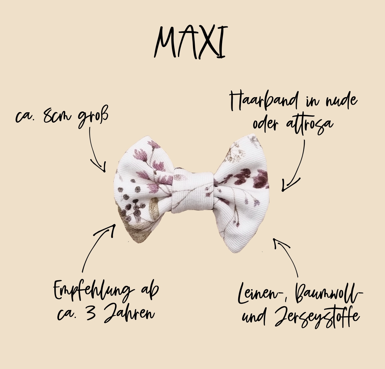Unsere Haarschleifen werden auf einer weißen Karte befestigt und lassen sich wunderbar verschenken. Das Schleifchen EMMY ist aus hochwertigem Jersystoff von Hand gefertigt – daher gleicht keine Harrschleife der anderen. Unsere Schleifen sind in den Größen mini, midi und maxi erhältlich und werden auf einem hochwertigen Nylon-Haarband befestigt. Die Haarbänder sind ca. 5mm breit und in den Farben nude und altrosa erhältlich. Durch ihre hohe Elastizität wachsen unsere Haarbändchen mit – passend von Newborn bis ins Kleinkindalter.