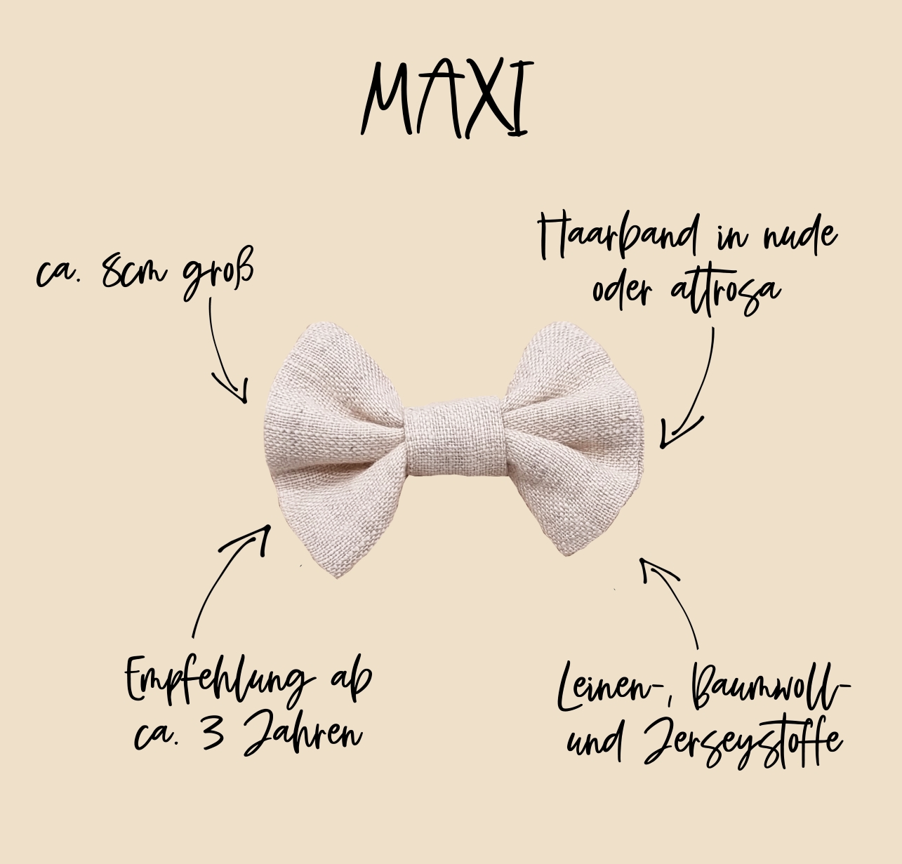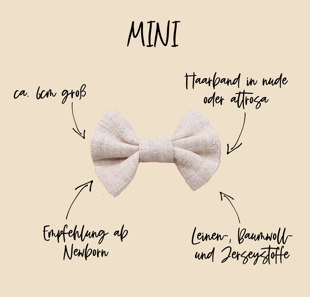 Unsere Haarschleifen werden auf einer weißen Karte befestigt und lassen sich wunderbar verschenken. Das Schleifchen ELLA ist aus hochwertigem Leinenstoff von Hand gefertigt – daher gleicht keine Harrschleife der anderen. Unsere Schleifen sind in den Größen mini, midi und maxi erhältlich und werden auf einem hochwertigen Nylon-Haarband befestigt. Die Haarbänder sind ca. 5mm breit und in den Farben nude und altrosa erhältlich. Durch ihre hohe Elastizität wachsen unsere Haarbändchen mit – passend von Newborn bis ins Kleinkindalter.
